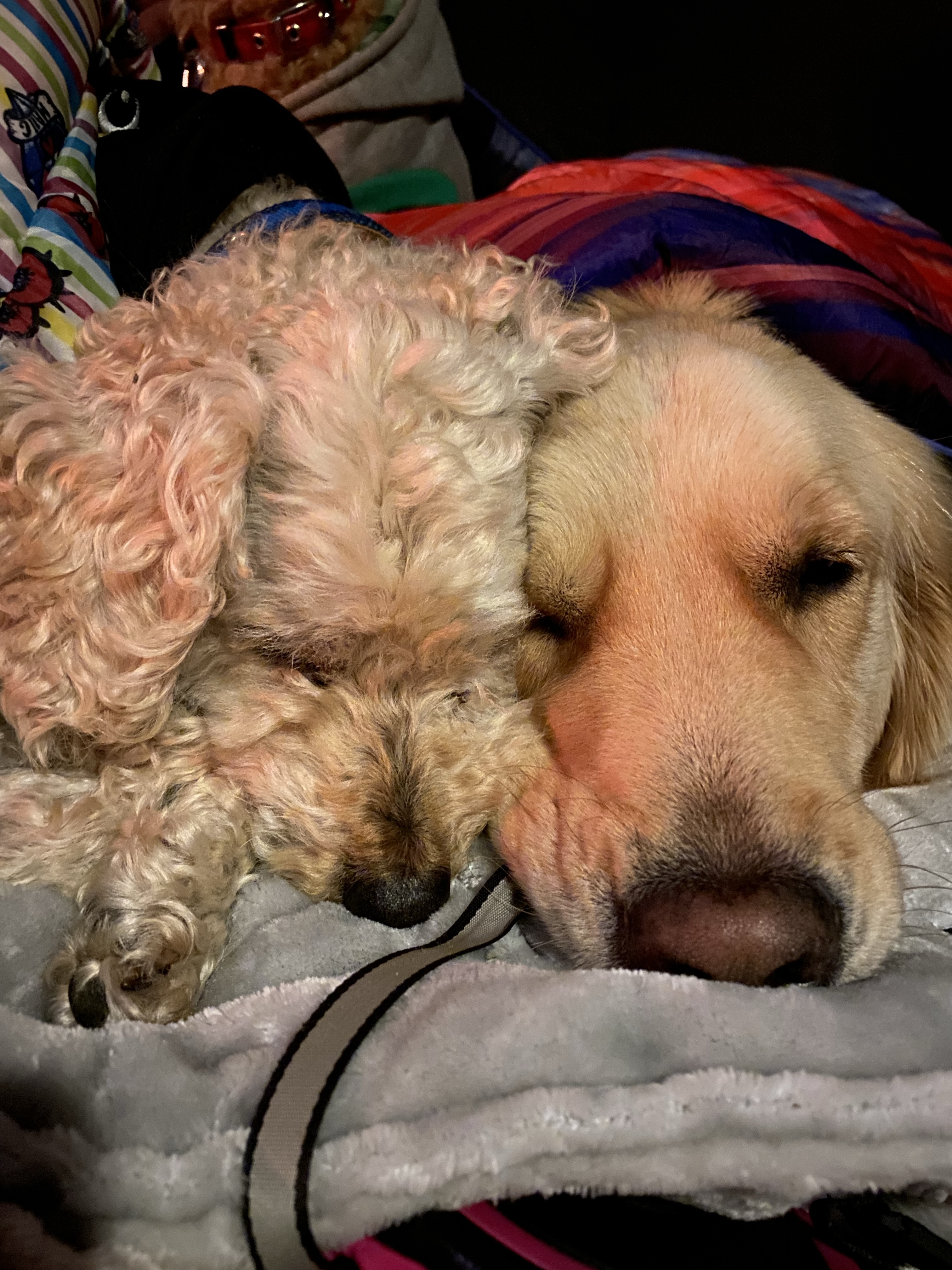 もちろん、寝る時もずっと一緒。(キャンプ場では野生動物もいますので、テントの外で寝かせるのは危ないです)